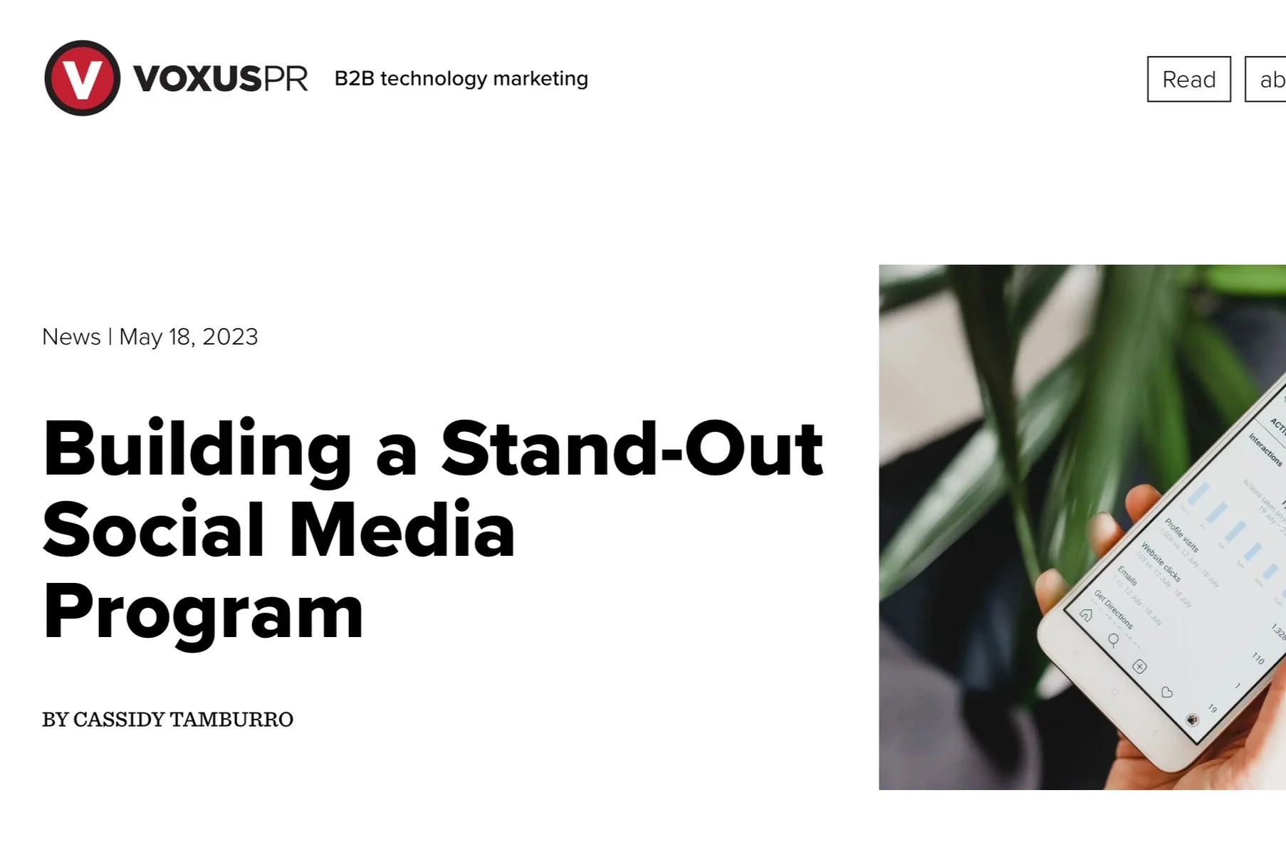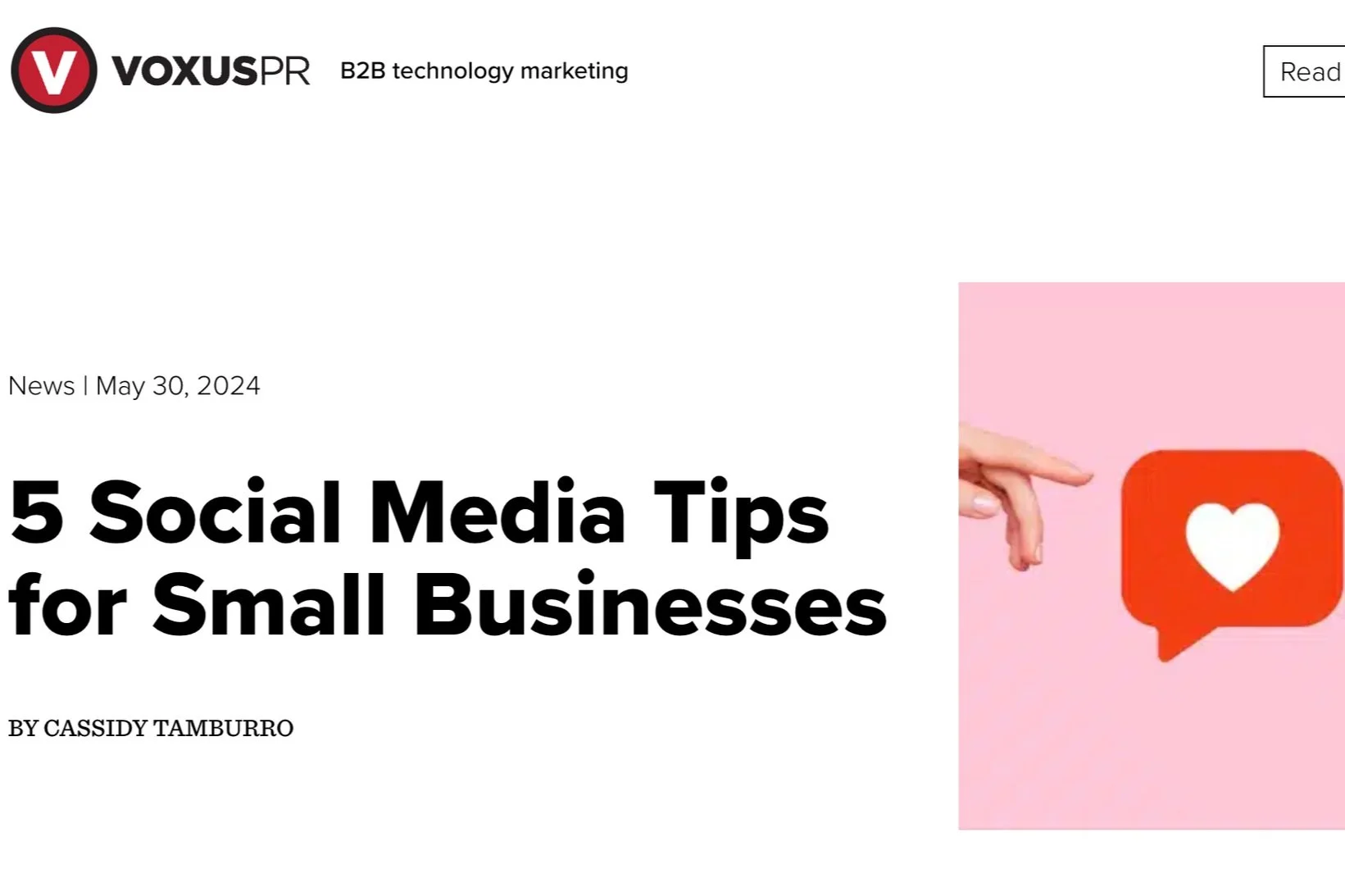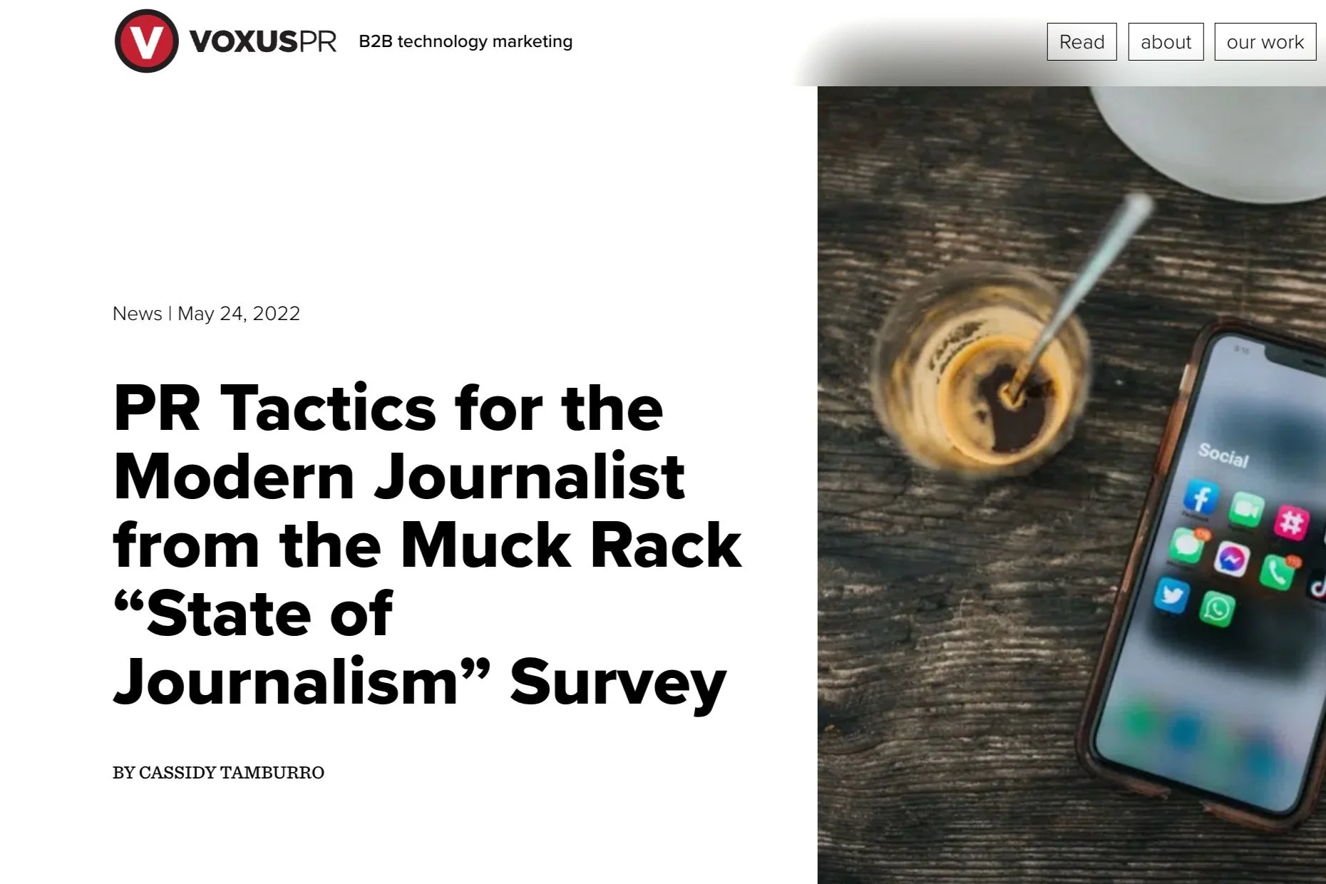 Cassidy Tamburro 12/22/24 Cassidy Tamburro 12/22/24 Navigating and Overcoming a LinkedIn Shadow Ban Read More Cassidy Tamburro 5/30/24 Cassidy Tamburro 5/30/24 5 Social Media Tips for Small Businesses Read More Cassidy Tamburro 12/5/23 Cassidy Tamburro 12/5/23 Social Media is the Newest Search Engine – Is Your Brand Ready? Read More Cassidy Tamburro 5/18/23 Cassidy Tamburro 5/18/23 Building a Stand-Out Social Media Program Read More Cassidy Tamburro 11/22/22 Cassidy Tamburro 11/22/22 A PR pro’s guide to pitching podcasts Read More Cassidy Tamburro 9/1/22 Cassidy Tamburro 9/1/22 Global study of journalists offers tactics for PRs to get better online coverage Read More Cassidy Tamburro 5/24/22 Cassidy Tamburro 5/24/22 PR Tactics for the Modern Journalist from the Muck Rack “State of Journalism” Survey Read More Cassidy Tamburro 11/23/21 Cassidy Tamburro 11/23/21 Four Tips for Creating a Newsletter and Coverage Report Read More Cassidy Tamburro 10/21/21 Cassidy Tamburro 10/21/21 9 tips for landing your first PR job Read More